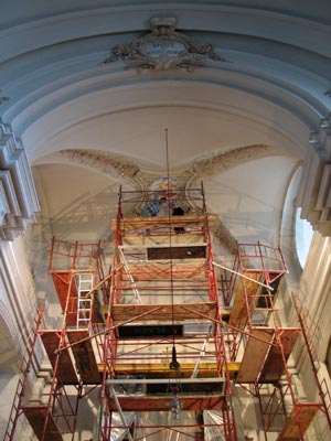 Endlich vorort. Das neue Deckenbild wurde installiert. Mit Textilkleber und Tacker sind wir dem "ungeliebten" Fresco zu Leibe gerückt.